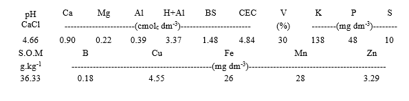 Đất của khu vực thí nghiệm là loại Latosol đỏ Dystrophic có kết cấu trung bình (21% sét) [9]. Khu vực thí nghiệm được sử dụng để sản xuất rau trong nhiều năm bằng cách bón phân hữu cơ và khoáng. Trước đây đến việc trồng bắp cải để nghiên cứu hiện nay, diện tích được trồng là bắp xanh. Các mẫu đất được thu thập trước khi lắp đặt thí nghiệm ở lớp đất 0-0,2 m, và các đặc tính hóa học của đất được phân tích theo phương pháp được mô tả bởi Raij và cộng sự. (2001) [10]. Kết quả hóa học của đất được trình bày trong Bảng 1.