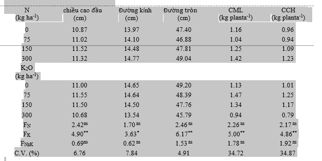 N = liều lượng nitơ; K2O = liều lượng oxit kali; ns = không đáng kể; “*” Và “**” = có ý nghĩa ở xác suất 5 và 1% theo phép thử F, tương ứng; FN: Giá trị thử nghiệm F đối với các liều yếu tố N; FK: Giá trị thử nghiệm F cho các liều yếu tố K; FNxK: Giá trị kiểm định F cho sự tương tác giữa các yếu tố N và K; C.V. (%) = hệ số biến thiên. CML = khối lượng tươi đầu của bắp cải với tất cả các lá; CCH = khối lượng đầu bắp cải tươi không có tất cả các lá (đầu bắp cải thương phẩm).