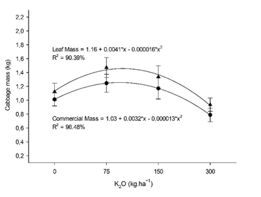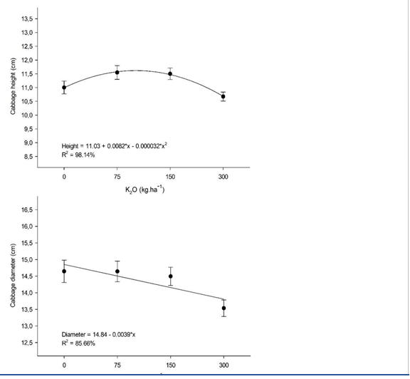 Liều lượng K2O tối đa (128 kg ha-1) cho chiều cao đầu bắp cải (11,56 cm); tuy nhiên, có xu hướng phản ứng tiêu cực với việc tăng liều lượng K2O đối với các biến khác được đánh giá. Tác động tiêu cực này có thể liên quan trực tiếp đến ảnh hưởng mặn của nguồn K được sử dụng (KCl) [18], hoặc thậm chí do sự cạnh tranh giữa các chất dinh dưỡng cation.
