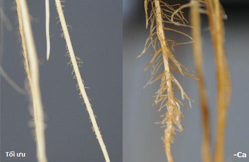 Triệu chứng Cây thiếu canxi có biểu hiện lá non bị vàng và héo. Chúng cũng có thể có các đầu bị tách hoặc cuộn, đôi khi có sự đổi màu trắng. Các lá già uốn cong. Sự phát triển của cây nói chung là còi cọc. Do Ca không được chuyển lại cho quá trình sinh trưởng mới nên các triệu chứng thiếu hụt thường xuất hiện đầu tiên trên các lá non. Rễ ngắn hơn nhiều và có màu nâu sẫm. Thiếu canxi có thể dẫn đến suy giảm chức năng của rễ và có thể khiến cây lúa bị thiếu sắt. Lý do thiếu Canxi. Hàm lượng Ca trong đất thấp hoặc sự hấp thụ Ca thấp (do cung cấp cation không cân đối) có thể là lý do