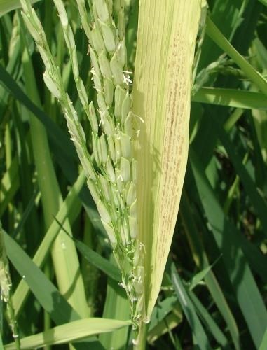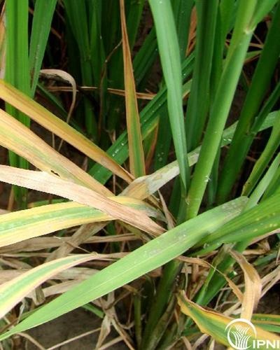 Triệu chứng Cây xanh đậm với mép lá màu nâu vàng và / hoặc đốm hoại tử màu nâu sẫm lần đầu tiên xuất hiện trên đầu các lá già (K rất di động trong cây và được phân bổ lại). Có thể xảy ra hiện tượng héo lá, cuốn lá và già sớm. Khả năng nhiễm sâu bệnh cao hơn. Tỷ lệ lớn các tiểu cầu vô trùng hoặc chưa được lấp đầy. Lý do Thiếu kali ('bệnh Pansukh' ở Punjab). Thiếu K có thể do - khả năng cung cấp K trong đất thấp - loại bỏ hoàn toàn rơm rạ - khả năng cố định K trong đất cao - thất thoát do rửa trôi - tỷ lệ Na: K, Mg: K, hoặc Ca: K trong đất và độ chua / mặn điều kiện - nhu cầu K cao hơn của lúa lai