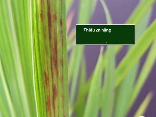 Triệu chứng Các đốm màu nâu sẫm đến hơi đỏ xuất hiện trên lá non hơi úa. Các lá già hơn có màu đồng bắt đầu từ mép lá trong khi gân giữa vẫn xanh trong một thời gian dài hơn. Với sự thiếu hụt liên tục, phiến lá hoàn chỉnh sẽ chuyển sang màu đồng đến nâu. Còi cọc, phát triển không đồng đều. Khi thiếu Zn nghiêm trọng, sự đẻ nhánh giảm hoặc thậm chí có thể dừng lại- Lý do Thiếu kẽm (bệnh Hudda - Pakistan, bệnh Khaira - Ấn Độ). Lúa mẫn cảm với thiếu Zn; Đây là bệnh rối loạn vi chất dinh dưỡng phổ biến nhất trên cây lúa. Khả năng sử dụng kẽm giảm sau lũ lụt. Thiếu Zn có thể do nhiều yếu tố gây ra, ví dụ: - pH cao (tạo Zn (OH) 2) - Kết tủa ZnS trong điều kiện yếm khí. - Nồng độ HCO3- cao - Hình thành Zn-photphat sau khi bón nhiều phân P. - Bón vôi quá nhiều.
