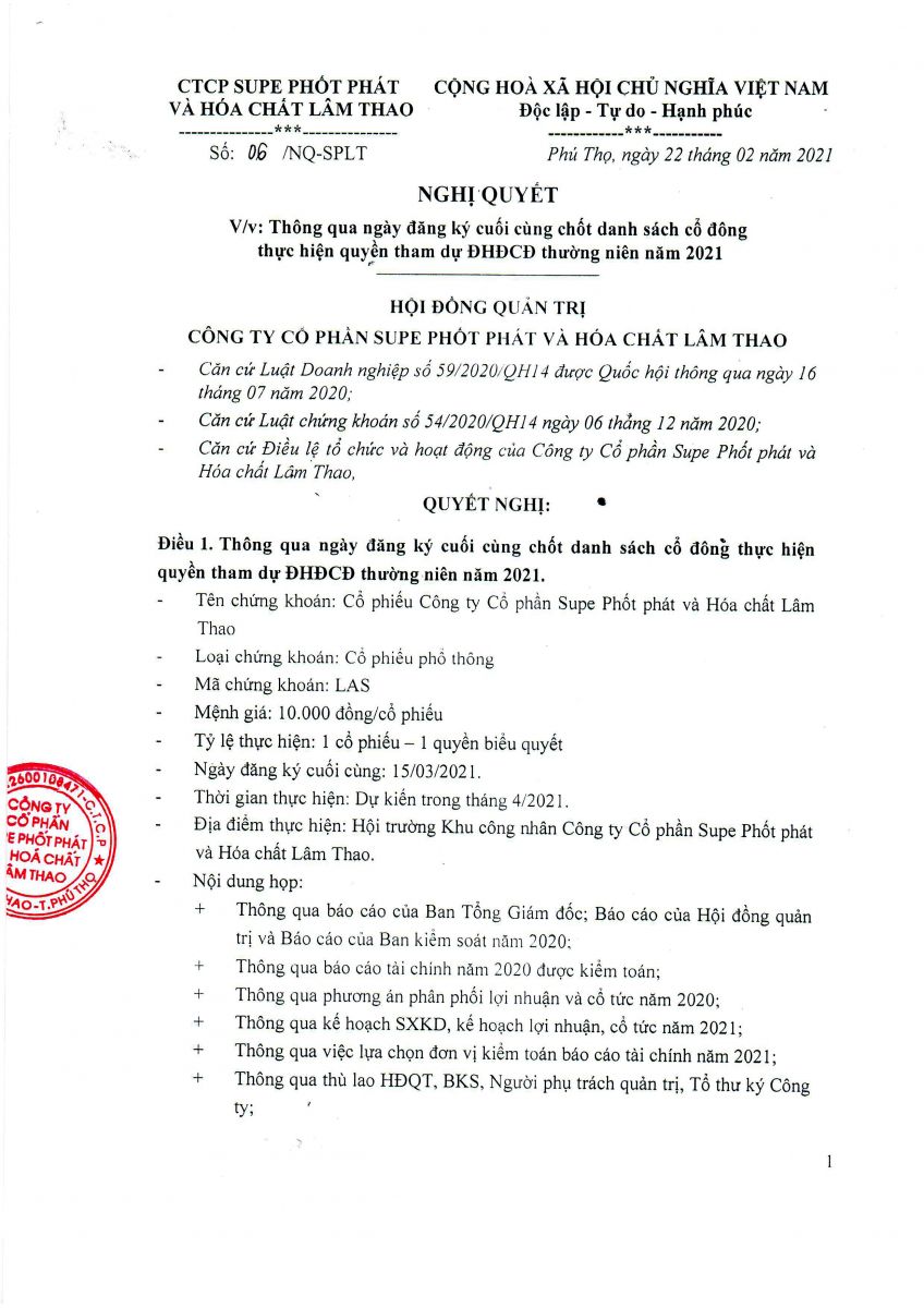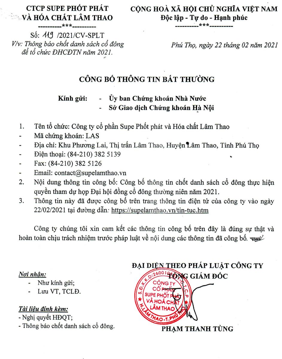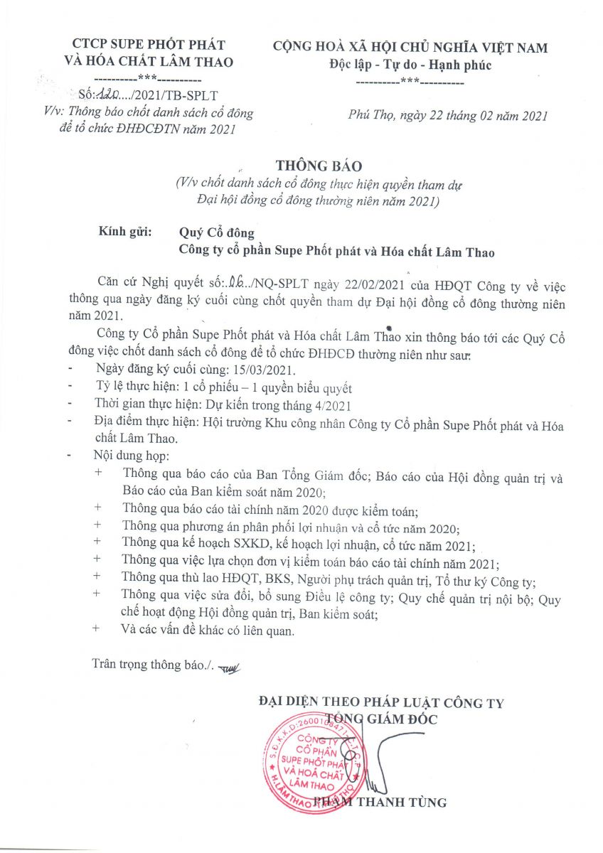 Thông báo chốt danh sách cổ đông để tổ chức Đại hội đồng cổ đông thường niên 2021
