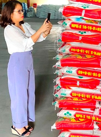 Chị Mai Thị Tươi quét tem kiểm tra sản phẩm phân bón Lâm Thao tại cửa hàng phân bón của Công ty Cổ phần Thương mại Tổng hợp Toan Vân, ngày 15/9/2021. Ảnh: Nguyễn Huy Tưởng.