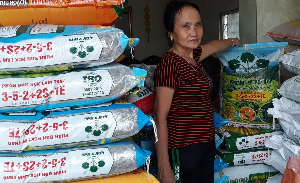 Bà Thời tại cửa hàng bán phân bón Lâm Thao: "Chỉ sản phẩm của Supe Lâm Thao mới có tem, và ba cành cọ mới có ®". Ảnh: Nguyễn Huy Tưởng.