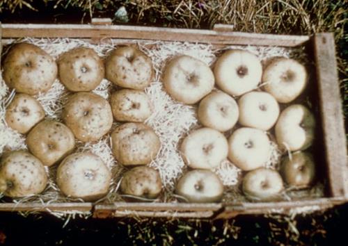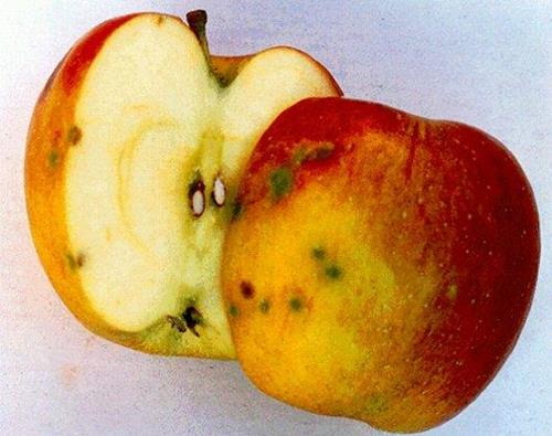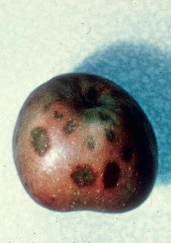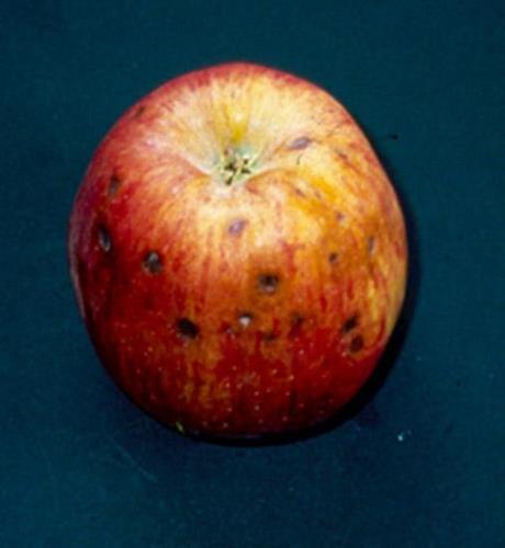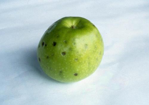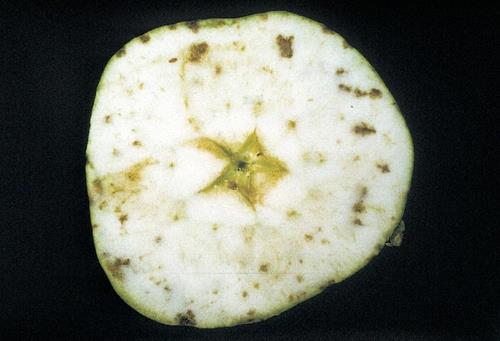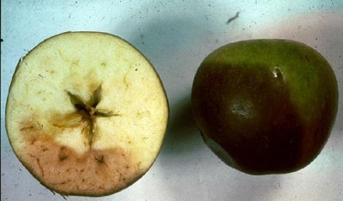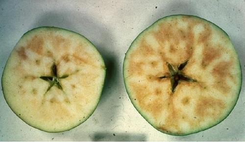 Nồng độ can xi thấp tạo ra các vết lõm trên bề mặt quả táo và các vùng sân nhỏ, màu nâu bên trong quả thịt. Thiếu can xi có thể nhầm lẫn với thiếu Bo gây ra các triệu chứng ở trạng thái phát triển ban đầu của quả, trong khi thiếu can xi sẽ gay ra các triệu chứng trước khi thu hoạch hoặc để trong kho