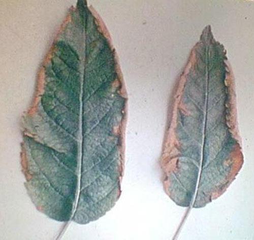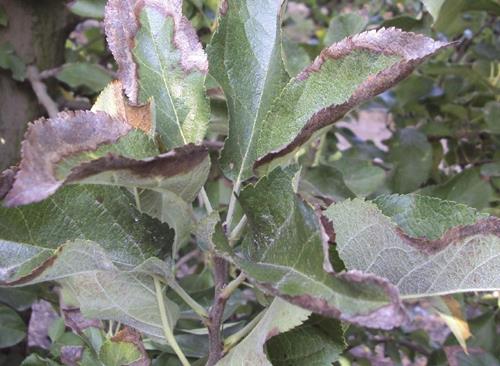 Lá già có màu hơi xanh với các mép bị cháy xém (nâu hoặc xám) đầu tiên có thể có màu xanh lục nhạt và sau đó chuyển sang hoại tử. Hoại tửu tiến triển từ mép vào trong giữa. Băng giá và hạn hạn có thể gây ra các triệu chứng tương tự