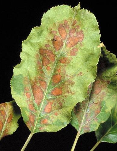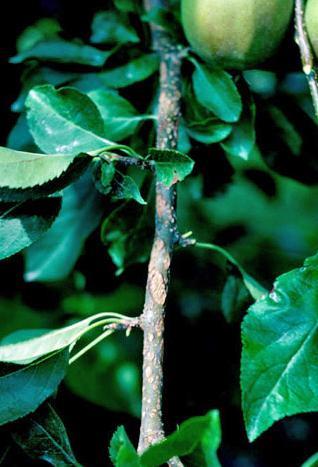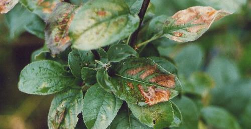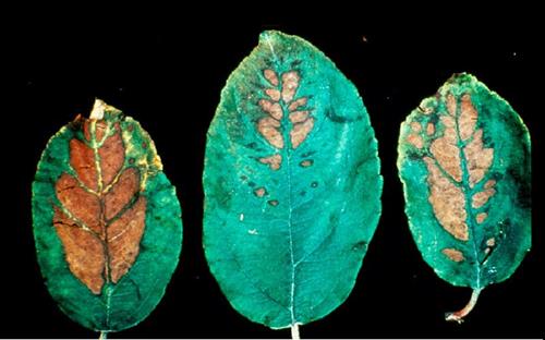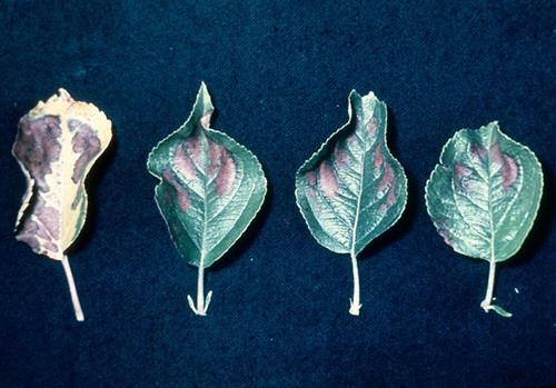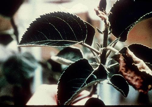 Triệu chứng xuất hiện đầu tiên là bệnh úa vàng giữa các gân chính bắt đầu từ lá già. Sau đó phát triển đến hoại tử giữa các đốt hoặc các đám hoại tử dọc theo tĩnh mạch chính. Thường thì rì lá vẫn xanh. Táo và các loại trái cây khác đôi khi bị hoại tử nay lập tức mà không bị úa trước đó.