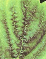 Triệu chứng xuất hiện ở lá non và lá chưa trưởng thành, lá có màu xanh nhạt toàn bộ lá, tuy nhiên chỉ phần thịt lá màu xanh nhạt còn gân lá vẫn duy trì màu xanh bình thường.