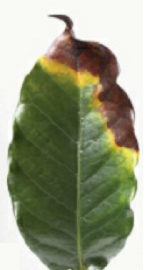 - Triệu chứng thiếu kali có thể dễ dàng nhận thấy khi mép lá và ngọn lá thường cuộn tròn lại. Trong giai đoạn đầu, lá thường chuyển vàng và sau đó chuyển thành màu nâu đen. Khi cây cà phê thiếu kali trầm trọng, một phần của lá xuất hiện các vệt bị chết có màu xám, đôi khi cả lá bị chết.