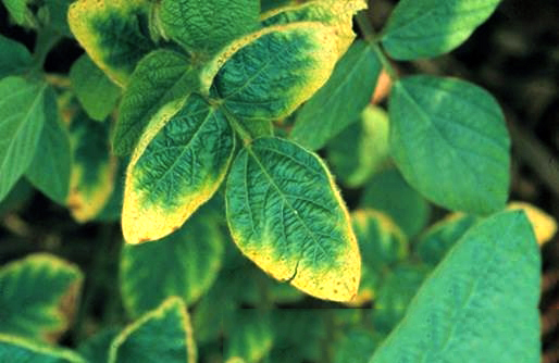 - Thiếu lưu huỳnh thường xuất hiện trên lá non, triệu chứng xanh vàng nằm giữa phần gân lá. Ngược với triệu chứng thiếu kali, triệu chứng thiếu lưu huỳnh thường xuất hiện từ phần gốc lá sau đó lan rộng toàn bộ phần bản lá. Trên mép lá thường xuất hiện các đốm hình dạng bất định màu nâu tối, lá bị cụp lại và chiều cao của cây thường bị thấp hơn bình thường và lóng ngắn lại.