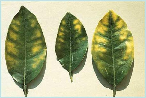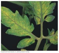 - Phần thịt lá giữa các gân lá thường chuyển thành màu vàng, trong khi gân chính và mép vẫn giữa màu xanh. Các vết hoại tử hoặc khô thường xuất hiện trên mép lá sau đó lan dần vào phần trung tâm của lá. Lá già thường xuất hiện triệu chứng thiếu magie đầu tiên.