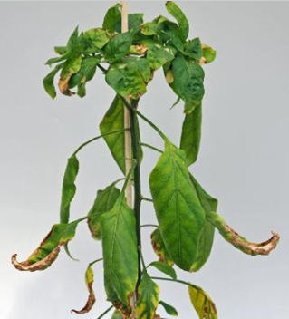 - Triệu chứng thiếu kali xuất hiện đầu tiên ở mép và giữa gân lá già, ban đầu màu vàng xuất hiện đầu ngọn lá sau đó lan dần theo hướng xuống phần cuốn lá và gây vàng toàn bộ lá. Đôi lúc, các đốm vàng xuất hiện trên lá của cây ớt thiếu kali, các đốm này sũng và lõm vào trong. Khi cây bị thiếu kali nặng, các đốm vàng liên kết lại với nhau tạo thành các vệt, sau đó các vệt này sẽ co lại làm cho lá bị rách hoặc hoại tử. Cây thiếu kali thường sinh trưởng kém và gây rụng lá