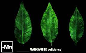- Vùng thịt lá giữa gân lá chuyển thành màu vàng khi thiếu mangan, trong khi gân lá vẫn duy trì màu xanh đen. Các đốm màu nâu tái thường xuất hiện giữa các gân lá. Triệu chứng thiếu mangan thường xuất hiện trên lá non.