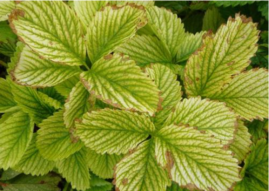Bệnh vàng da Cây thiếu Fe thường có màu lá xanh nhạt (úa), phân biệt rõ giữa gân xanh và mô giữa màu vàng.