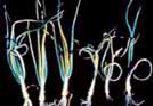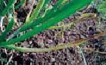 Lá trở nên xanh vàng mọc thẳng đứng cong queo, héo và lùn. Khi trưởng thành, mô trên củ trở nên mềm