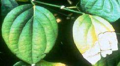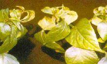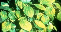 Triệu chứng: Giảm tốc độ tăng trưởng. Lá phát triển thành các đốm đặc trưng sau đó là các vết hoại tử dọc theo gân lá và rụng lá.