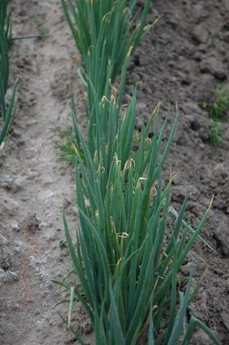 Ngọn lá chuyển lá sang màu trắng và xoắn như nút chai hoặc uốn cong theo góc vuông có thể bị úa và chết. Việc cung cấp đủ đồng rất quan trọng cho việc phát triển của củ hành