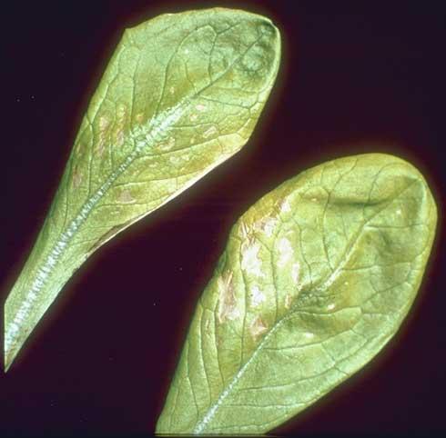 Triệu chứng Các triệu chứng thiếu kẽm trên rau diếp bắt đầu trên các lá già hoặc trung bình. Chúng phát triển các đốm hoại tử có màu xanh xám, xám có viền nâu ở mép lá. Các vùng hoại tử tăng nhanh và chảy cùng nhau. Những phần lá không bị ánh sáng chiếu vào vẫn có màu xanh. Tăng trưởng bị hạn chế. Thiếu kẽm trong giai đoạn phát triển ban đầu sẽ gây ra hiện tượng phân hoa, không hình thành đầu. Lý do Thiếu kẽm trên lá so với nguồn cung cấp tối ưu