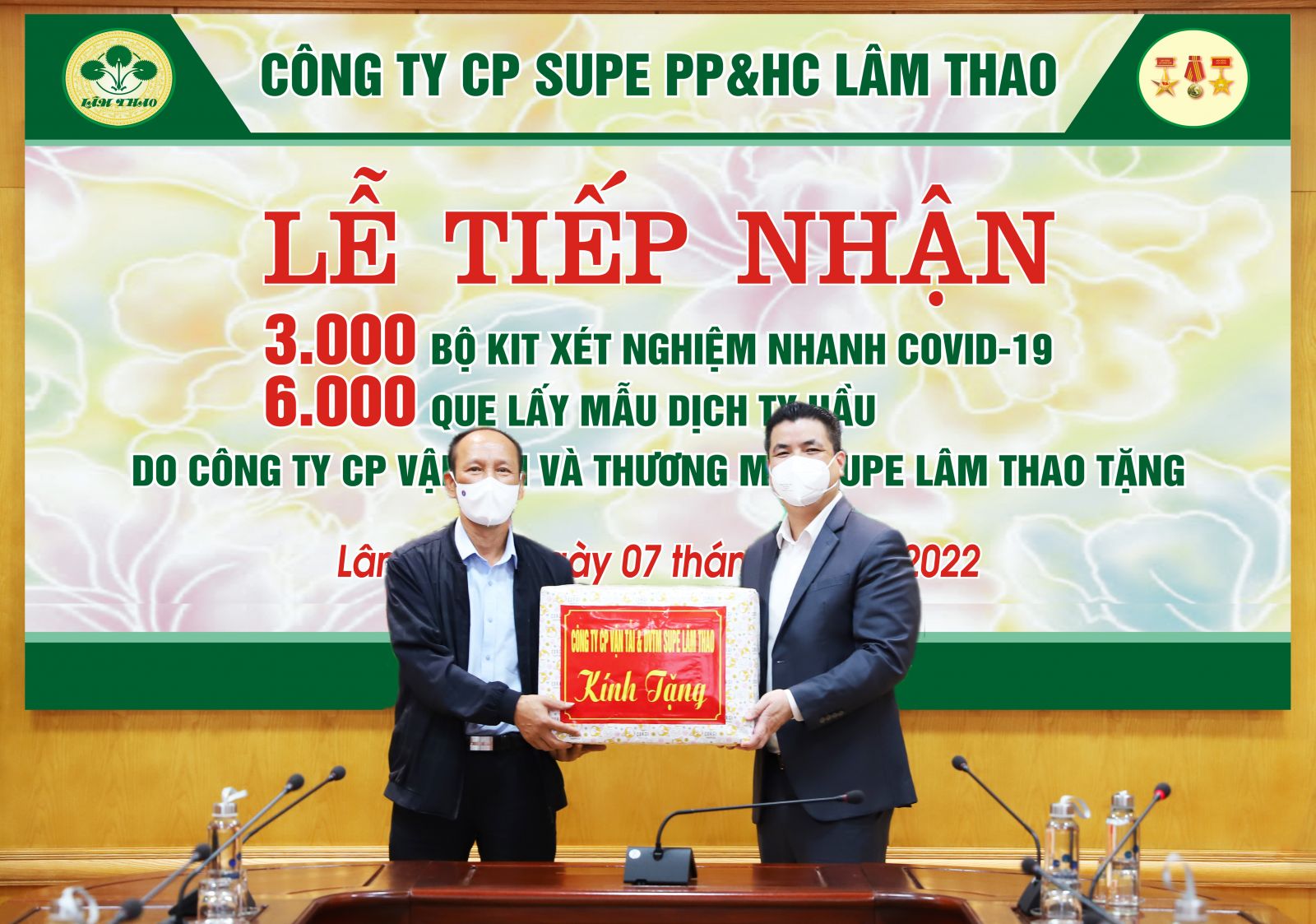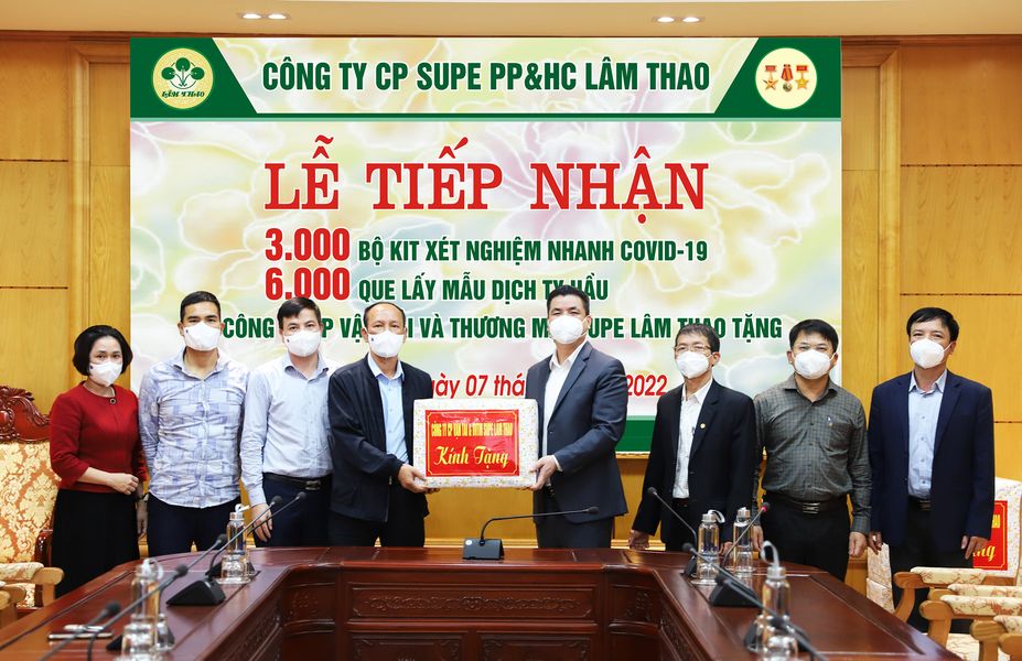 Sáng ngày 7/3/2022, Công ty CP Supe PP&HC Lâm Thao đã tiếp nhận ủng hộ 3.000 bộ kit xét nghiệm nhanh Covid-19 và 6.000 que lấy mẫu dịch tỵ hầu do Công ty CP Vận tải và Thương mại Supe Lâm Thao trao tặng.