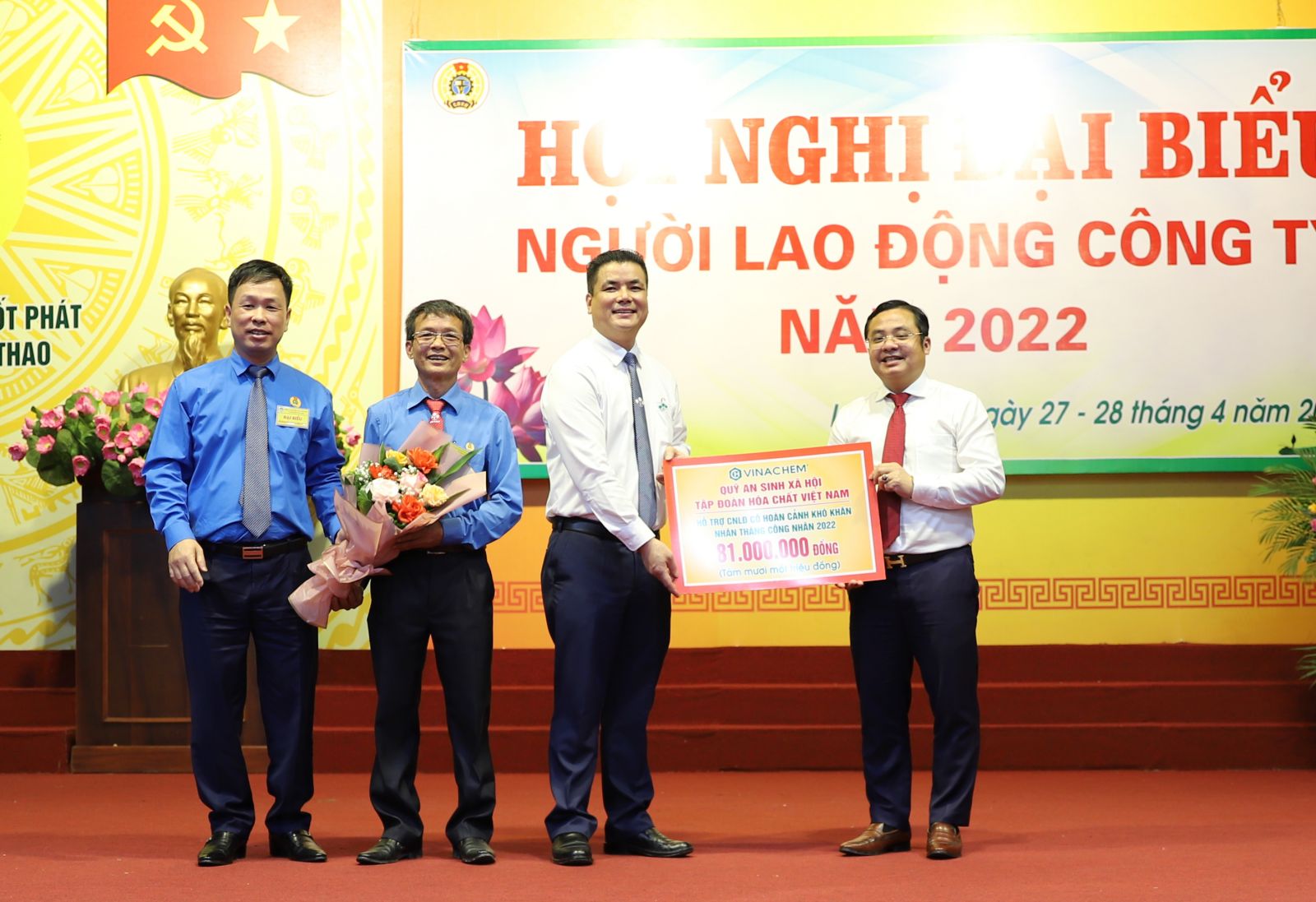 Dịp này, thay mặt Quỹ an sinh xã hội của Tập đoàn Hóa chất Việt Nam, đồng chí Phùng Quang Hiệp, Tổng Giám đốc đã trao quà hỗ trợ cho 81 người lao động có hoàn cảnh khó khăn của Công ty nhân tháng công nhân năm 2022.