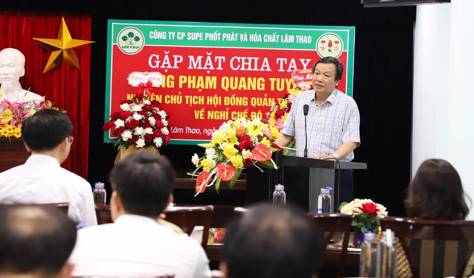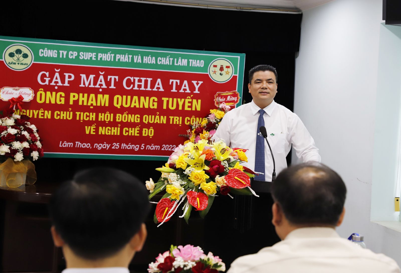 Với tinh thần trân trọng quá khứ và ghi nhận công lao của lớp người đi trước là yếu tố quan trọng đã tạo lập nên những giá trị bền vững cho tương lai của Công ty CP Supe PP&HC Lâm Thao trong nhiều năm qua. Với ý nghĩa đó, chiều ngày 25/5/2022, Công ty tổ chức buổi gặp mặt chia tay đồng chí Phạm Quang Tuyến, nguyên Chủ tịch Hội đồng Quản trị Công ty về nghỉ hưu theo chế độ của Nhà nước.