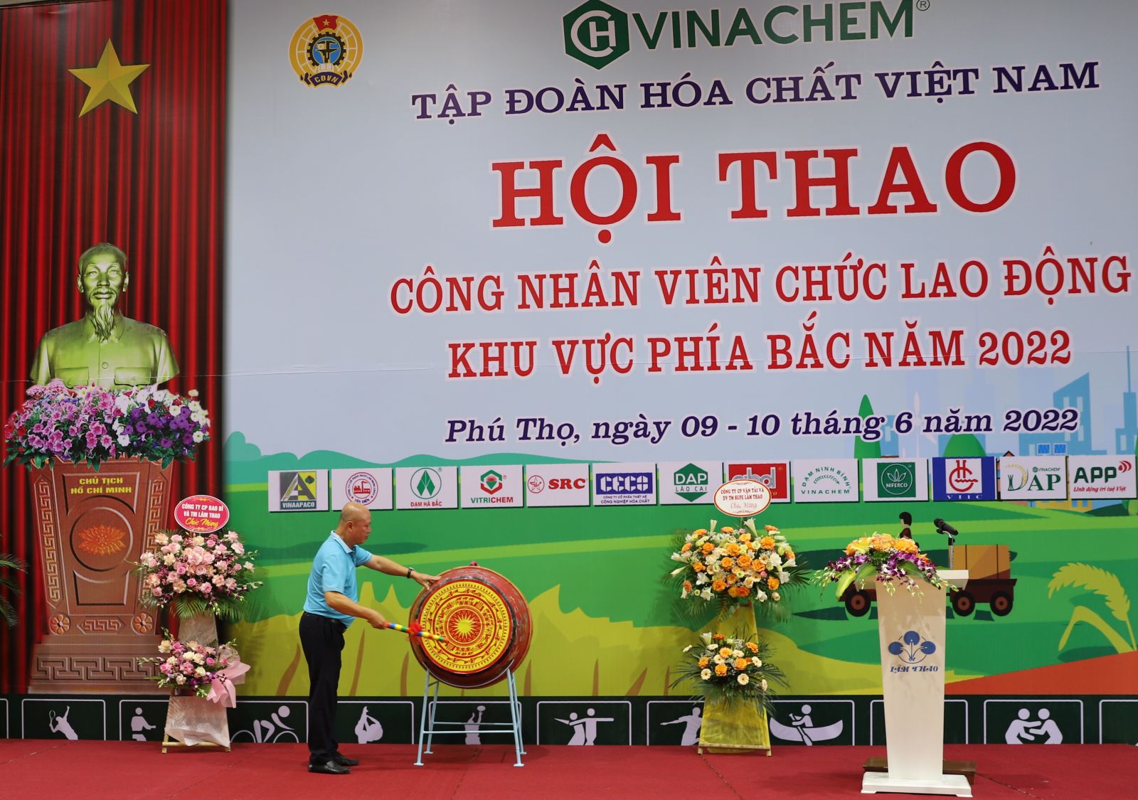Đồng chí Nguyễn Phú Cường, đại diện Lãnh đạo Tập đoàn Hóa chất Việt Nam đã đánh trống khai Hội, tiếng trống vang lên rộn ràng, báo hiệu một Hội thao tràn đầy cảm xúc và tình đoàn kết của các đơn vị thành viên trong Tập đoàn.