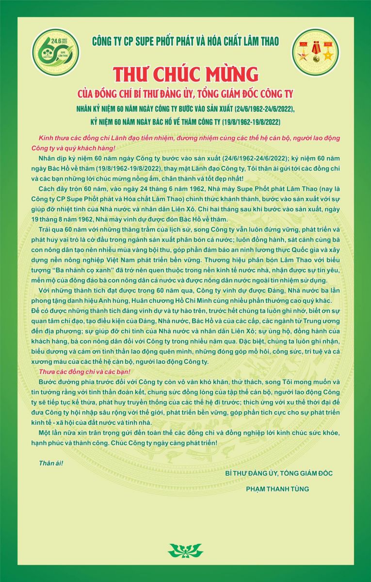 Trang tin Supe Lâm Thao xin trân trọng giới thiệu toàn văn THƯ CHÚC MỪNG CỦA ĐỒNG CHÍ BÍ THƯ ĐẢNG UỶ, TỔNG GIÁM ĐỐC CÔNG TY PHẠM THANH TÙNG NHÂN DỊP KỶ NIỆM 60 NĂM NGÀY CÔNG TY CP SUPE PHỐT PHÁT VÀ HOÁ CHẤT LÂM THAO BƯỚC VÀO SẢN XUẤT (24/6/1962-24/6/2022), 60 NĂM NGÀY BÁC HỒ VỀ THĂM CÔNG TY (19/8/1962-19/8/2022)