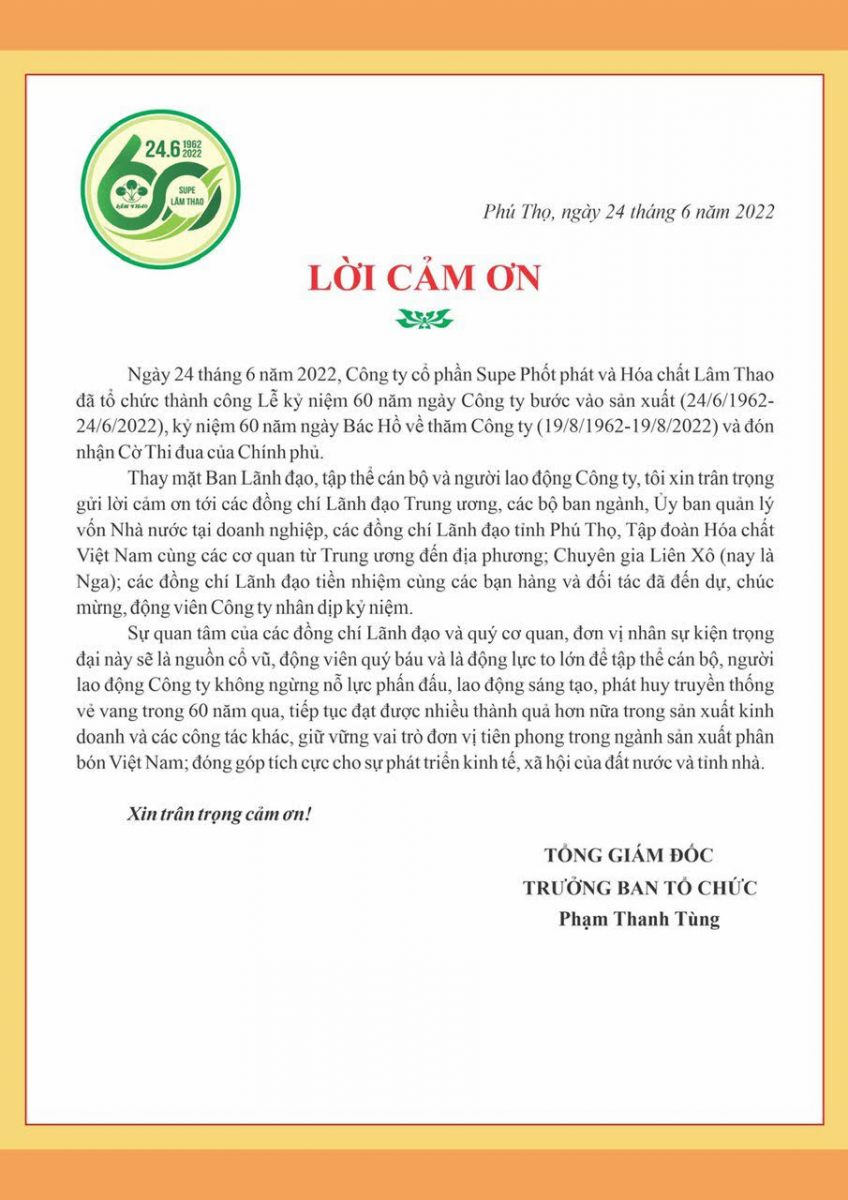 THƯ CẢM ƠN của đồng chí Bí thư Đảng ủy, Tổng Giám đốc Công ty Phạm Thanh Tùng, Trưởng Ban tổ chức Lễ kỷ niệm 60 năm ngày Công ty bước vào sản xuất (24/6/1962 - 24/6/2022), kỷ niệm 60 năm ngày Bác Hồ về thăm (19/8/1962 - 19/8/2022) và đón nhận Cờ thi đua của Chính phủ.