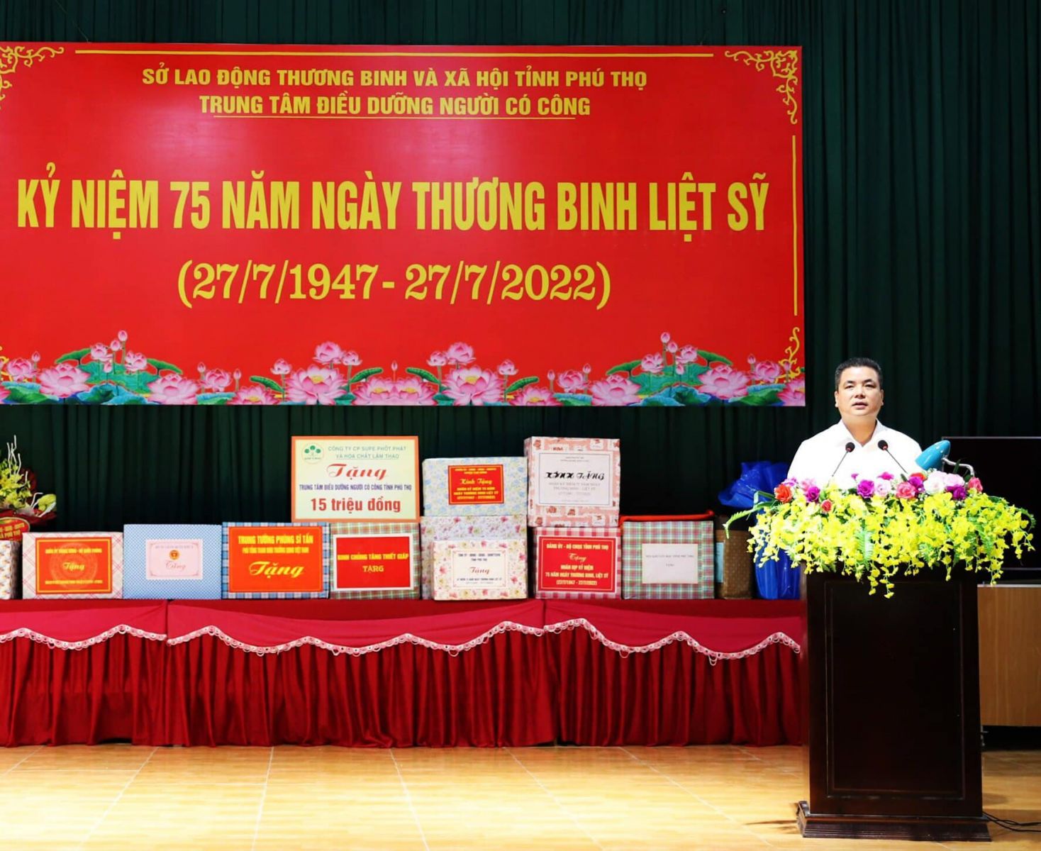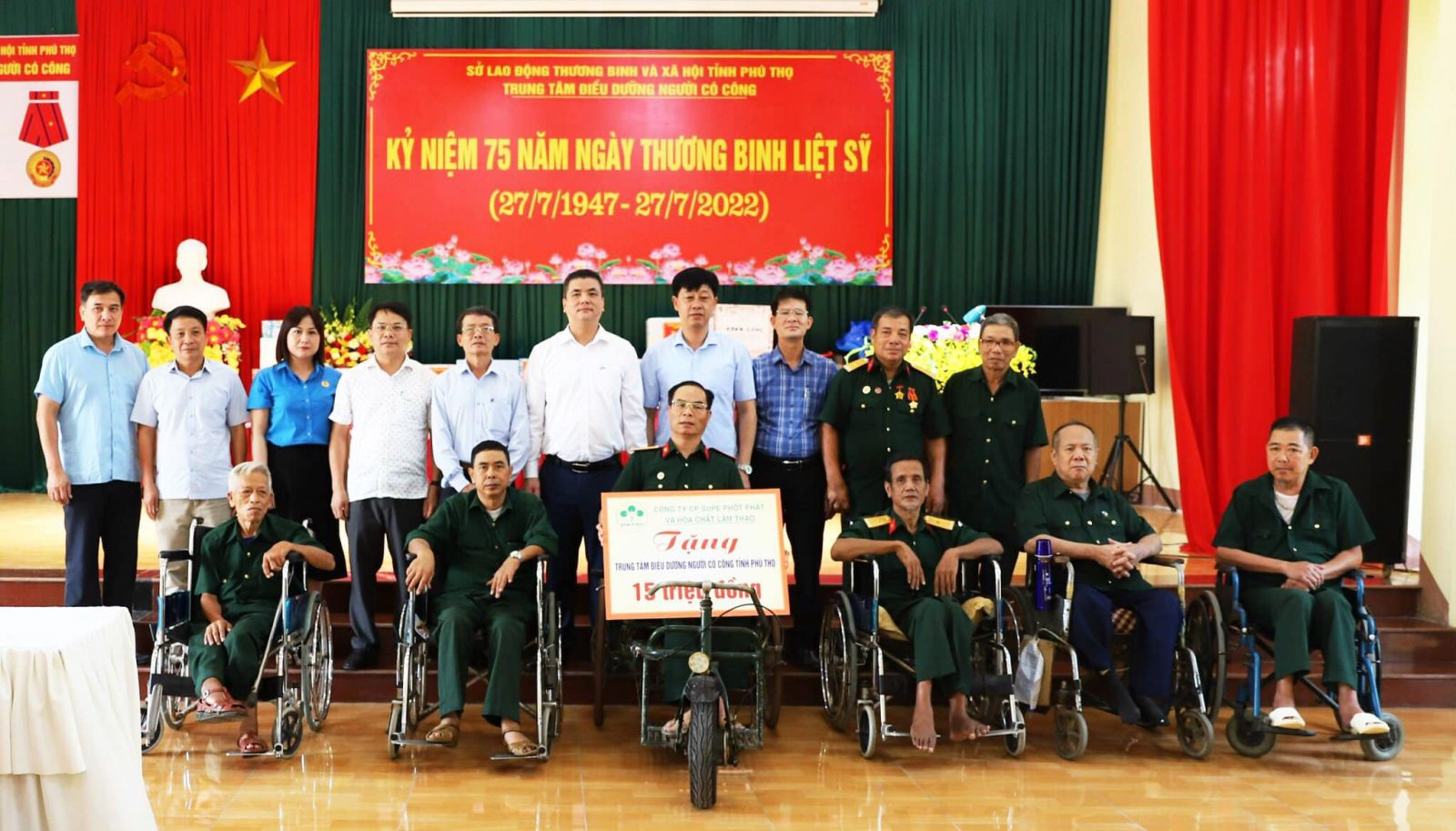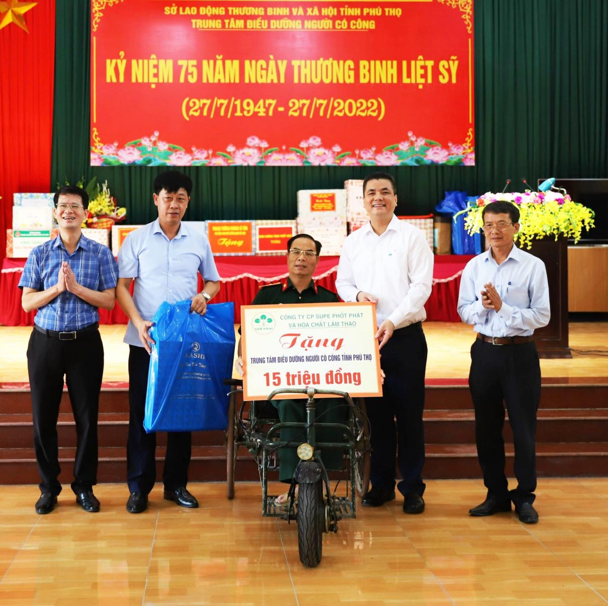 Nhân dịp kỷ niệm 75 năm ngày Thương binh – Liệt sĩ (27/7/1947 - 27/7/2022), phát huy truyền thống “Uống nước nhớ nguồn”, “Ăn quả nhớ người trồng cây”, sáng 20/7/2022, Đoàn Lãnh đạo Công ty CP Supe Phốt phát và Hoá chất Lâm Thao do đồng chí Phạm Thanh Tùng, Bí thư Đảng ủy, Tổng Giám đốc làm Trưởng đoàn đã tới thăm, tặng quà các thương, bệnh binh tại Trung tâm Điều dưỡng người có công tỉnh Phú Thọ. Cùng đi có các đồng chí: Lê Văn Hoằng, Chủ tịch Công đoàn Công ty; Nguyễn Quốc An, Chánh Văn phòng Công ty; đồng chí Vũ Xuân Chường, Tổng Biên tập Báo Phú Thọ.