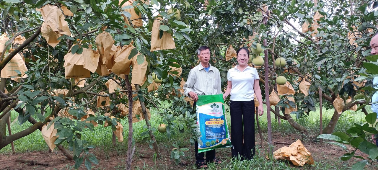 Chia sẻ về kinh nghiệm chăm sóc phân bón Lâm Thao cho cây bưởi, chị Đô cho biết: hàng năm, gia đình bón phân cho bưởi theo bốn đợt như khuyến cáo: