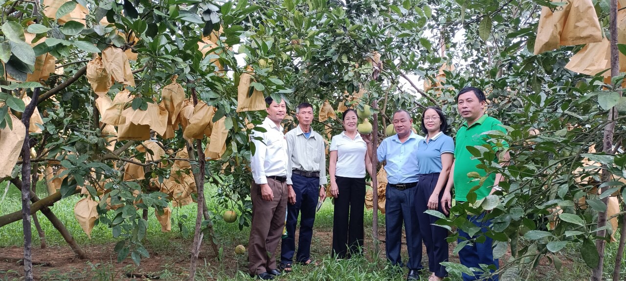 Các đại biểu của Hội Nông dân huyện Hương Khê và xã Hương Trạch cùng cán bộ thị trường của Supe Lâm Thao tham quan vườn bưởi của gia đình chị Hoàng Thị Đô