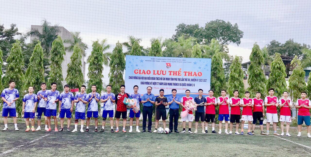 Hướng tới chào mừng Đại hội đại biểu Đoàn TNCS Hồ Chí Minh tỉnh Phú Thọ lần thứ XVI, nhiệm kỳ 2022-2027. Chào mừng kỷ niệm 77 năm Cách mạng tháng Tám và Quốc Khánh 2/9, hưởng ứng cuộc vận động “Toàn dân rèn luyện thân thể theo gương Bác Hồ vĩ đại”. Chiều ngày 10/8 tại sân vận động xã Tứ Xã huyện Lâm Thao đã diễn ra trận thi đấu giao hữu Bóng đá giữa đội tuyển Đoàn Thanh niên Công ty CP Supe PP&HC Lâm Thao với đội tuyển Huyện Đoàn Lâm Thao